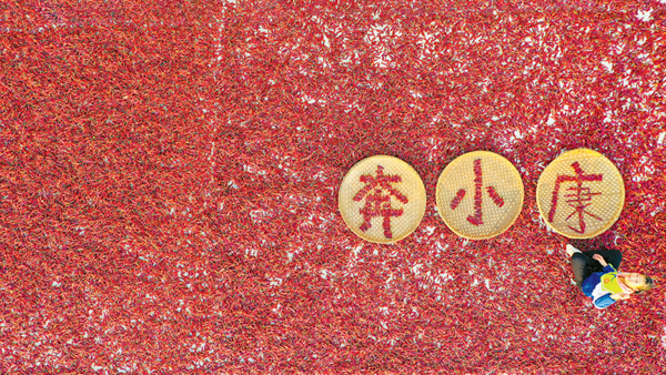 貴州遵義市將辣椒作為農(nóng)業(yè)發(fā)展的主導(dǎo)產(chǎn)業(yè),成立“助農(nóng)惠農(nóng)”扶貧車間,吸納貧困勞動力家門口就業(yè),助其增收致富。圖為該市新蒲新區(qū)三堡村村民以辣椒為“紙”,書寫“奔小康”表達(dá)豐收喜悅。