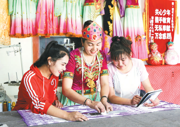 新疆拜城縣發(fā)揮民間技能人才的傳幫帶作用,幫助轄區(qū)待業(yè)婦女掌握致富技能、找到致富門路。該縣布隆鄉(xiāng)歐吐拉布隆村阿依拉蘭手工藝品農(nóng)民專業(yè)合作社縫紉老師(中)在指導(dǎo)學(xué)徒裁剪服飾。