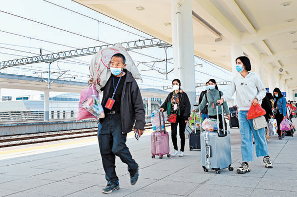 湖南洞口縣人社局定制2趟務(wù)工專列免費運送2209名農(nóng)村務(wù)工人員前往廣州、虎門、深圳,并由當(dāng)?shù)厝松绮块T統(tǒng)一接送到工作單位。圖為外出務(wù)工人員準(zhǔn)備乘坐專列赴廣東。