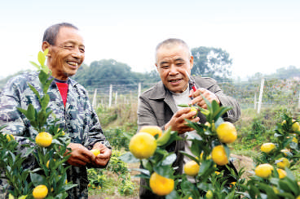 2020年以來,江西省上高縣人社局圍繞特色林果產(chǎn)業(yè)基地,依托20余名高校專家教授組成“名師團(tuán)”,培訓(xùn)貧困農(nóng)民。在該縣斜溪村的扶貧產(chǎn)業(yè)基地里,汪劍鳴教授(右)正講解“砂糖蜜桔”的種植要點。